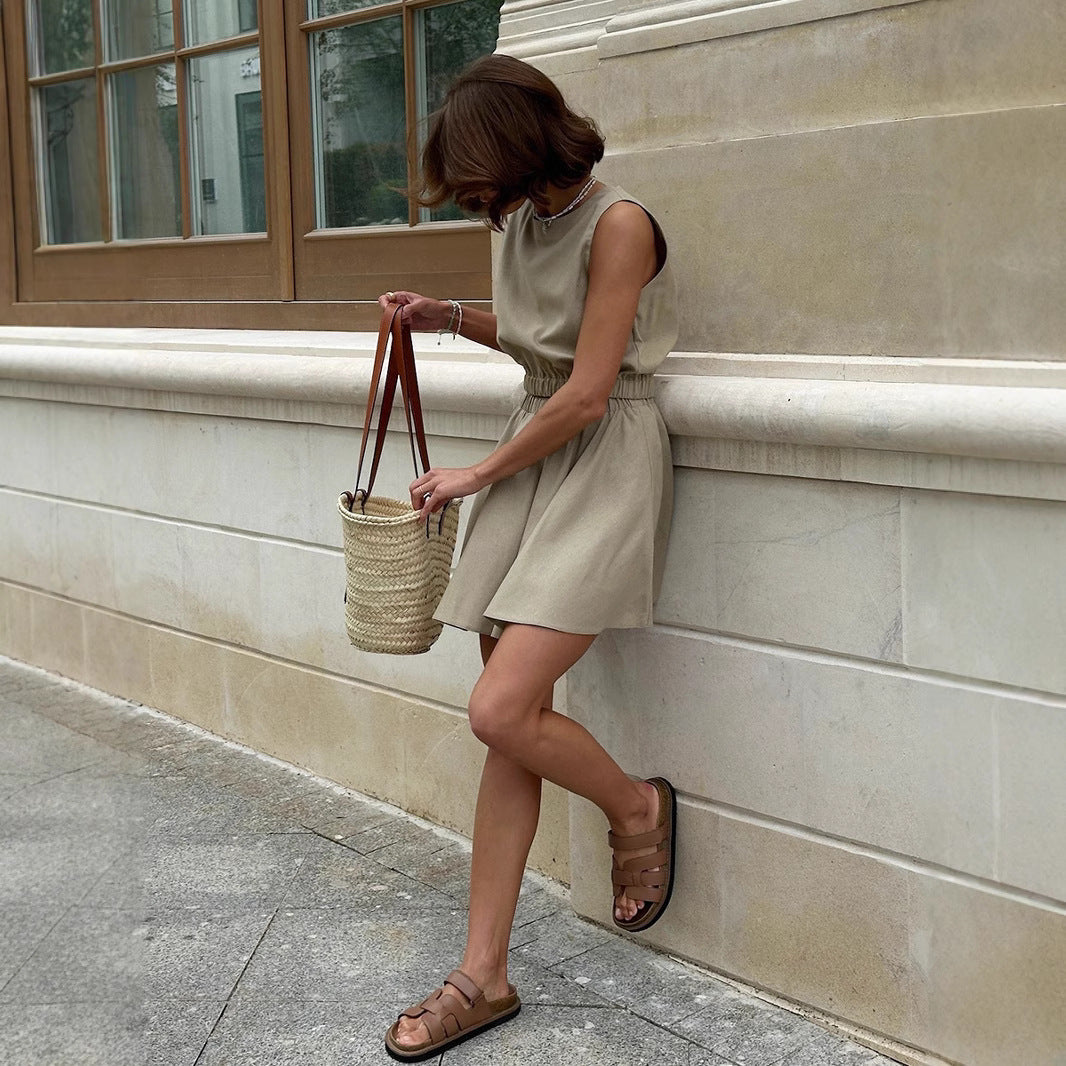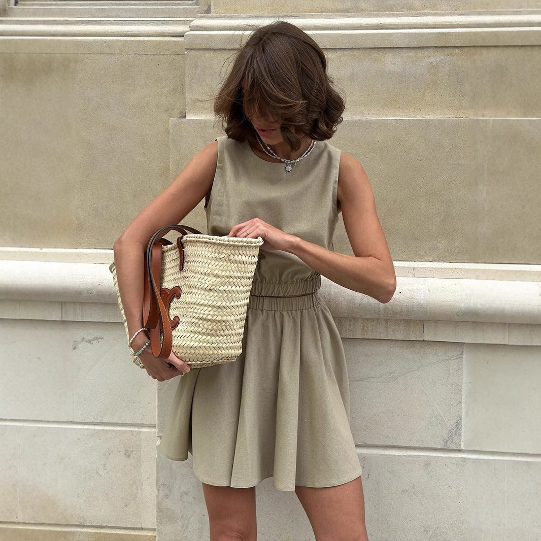 Dieses zweiteilige ensemble ist die definition von lässigem chic. es besteht aus einem ärmellosen top mit geraffter taille und einem fließenden kurzen rock, der sich der figur anpasst und dabei absolut bequem ist. perfekt für einen stadtbummel, urlaub oder einen sonnigen tag, begleitet es dich mit natürlicher eleganz. ein leichtes, frisches und zeitloses essential.