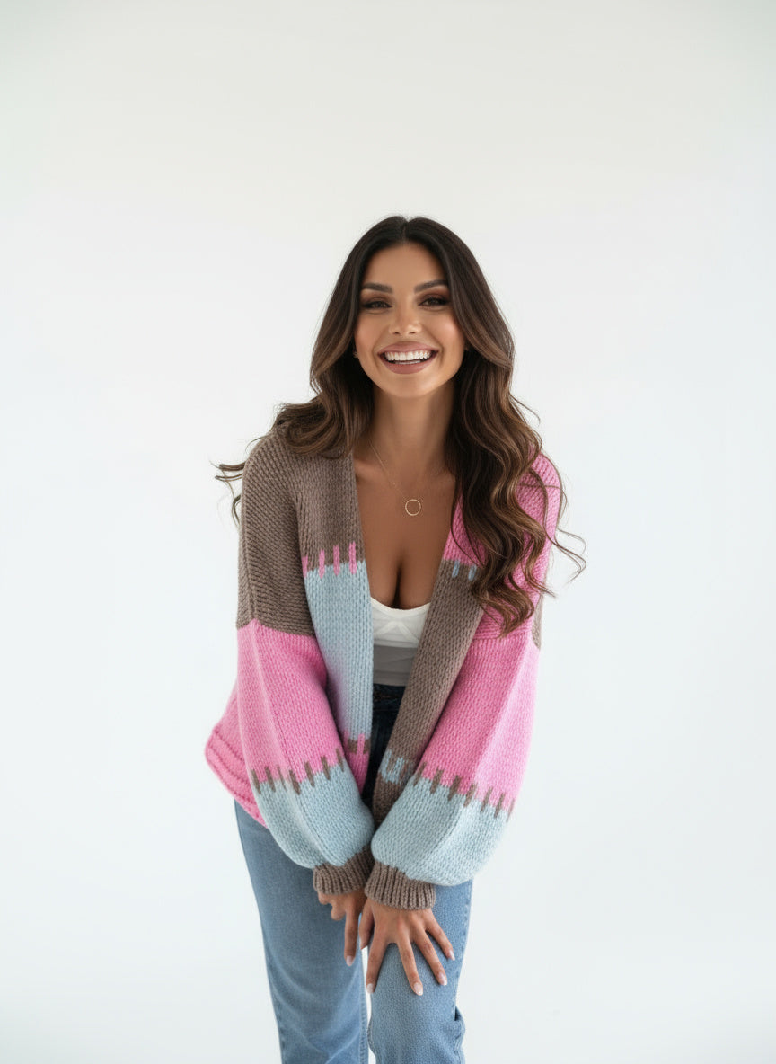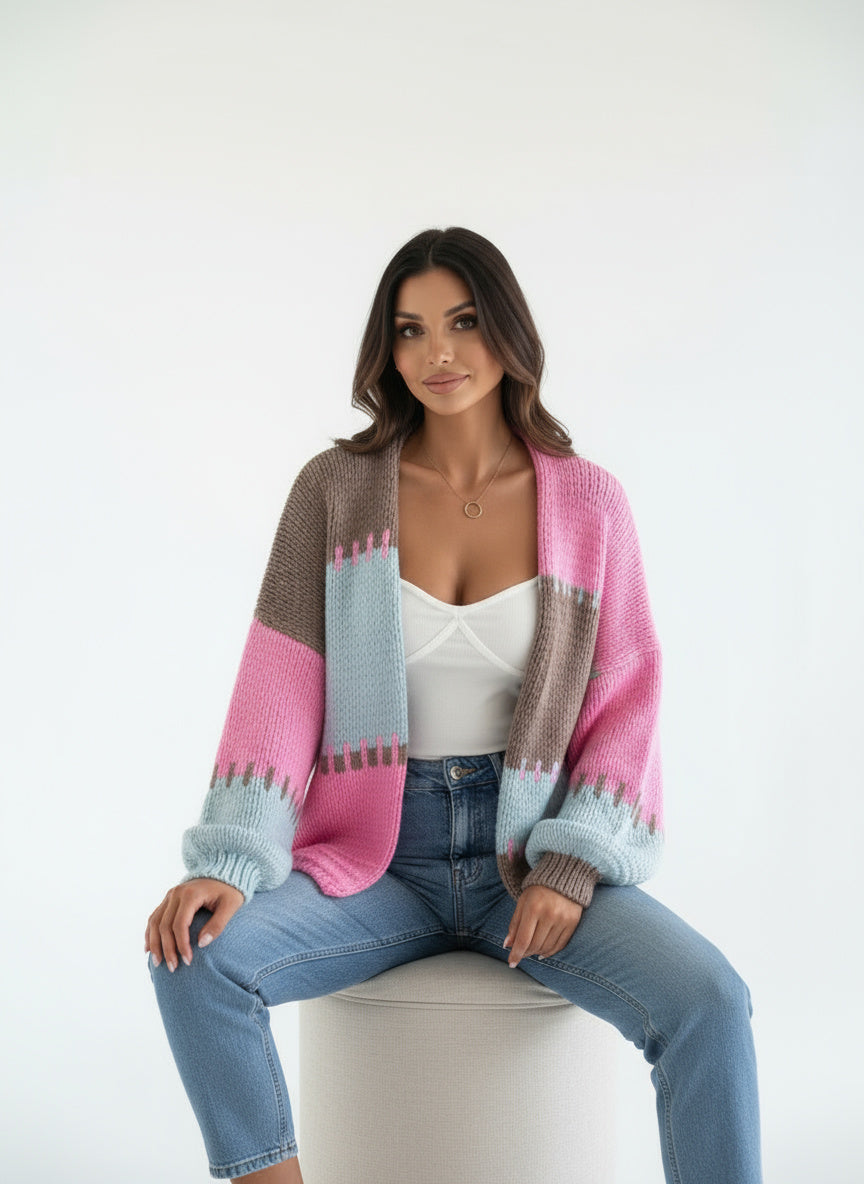 Dieser cardigan bringt farbe und gemütlichkeit in deinen alltag. das auffällige kontrastdesign in rosé, blau und braun sorgt für einen modernen look, während die weiche strickqualität höchsten tragekomfort garantiert. die lockere passform und die weiten laternenärmel machen ihn zum perfekten begleiter für entspannte casual-outfits.